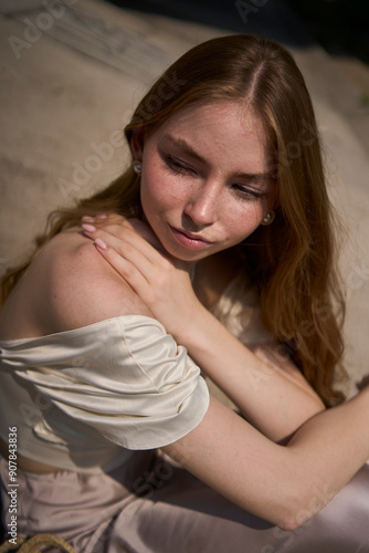 beautiful teenage girl in a silk skirt and corset in the old money style. Fashion photoshoot under the bridge.