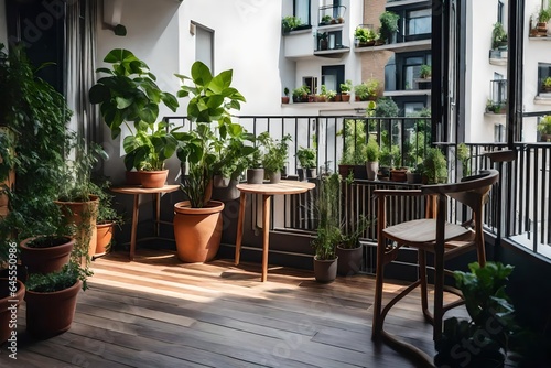 Beautiful terrace or balcony with a hardwood floor, a chair, and green plants in pots. cozy retreat in the house. In the city, a bright, trendy balcony terrace