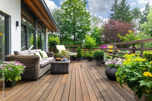 Beautiful terrace with wood flooring. Modern home outdoor