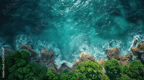 Beautiful top view of the landscape, Clear blue water of the ocean, waves crashing against the mountain,