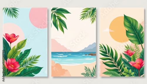 Beautiful Tropical Beach Scenes with Vibrant Floral and Ocean Views