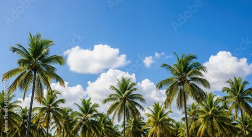 Beautiful tropical landscape featuring a dense canopy of green palm trees against a clear blue sky dotted with soft white clouds.