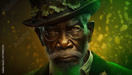 Beautiful Unique and Artistic Designer Wallpaper Featuring African American Elderly Man as Leprechaun: Saint Patrick's Day Background Design Celebrating Diversity Equity Inclusion DEI (generative AI
