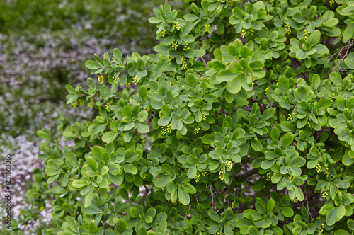 Beautiful unripe barberry bush in the spring garden. Family name Berberidaceae, Scientific name Berberis. Blurred image, selective focus