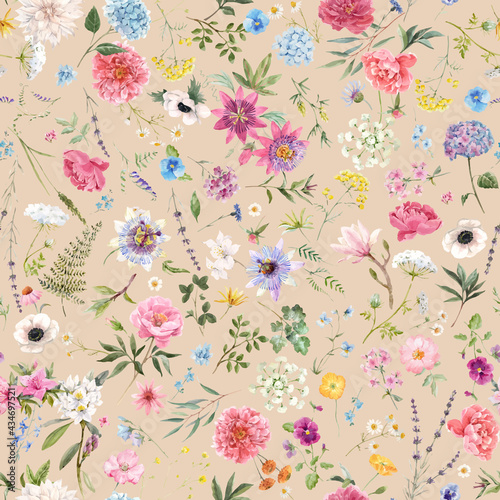 Beautiful vector seamless floral pattern with watercolor hand drawn gentle summer flowers. Stock illustration. Natural artwork.