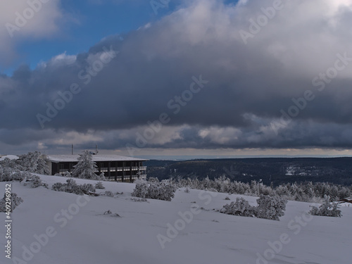 Beautiful view over Schliffkopf hill, Germany in the Black Forest mountains with hotel building and snow-covered meadow with frozen trees in deep snow on cloudy day in winter season.