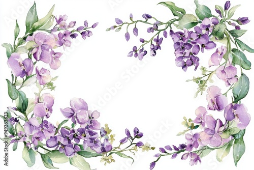 Beautiful watercolor floral frame featuring delicate purple orchids and lush green leaves, perfect for invitations and decor.