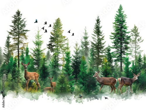 Beautiful watercolor illustration of deer in the forest with tall green trees and birds flying overhead, showcasing serene wildlife and nature