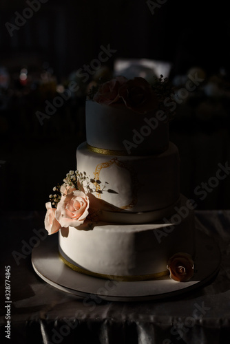 Beautiful wedding cake with colorful roses in the sunlight