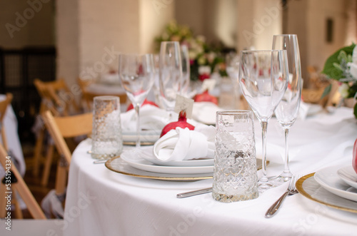 Beautiful wedding decoration. Banquet table setting and decoration. Flower decoration of wedding tables. Cutlery on the table.
