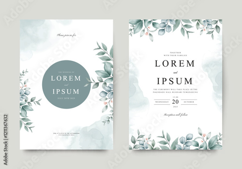 Beautiful wedding invitation template set with watercolor floral leaves