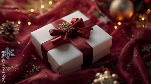 Beautiful white gift box with a red ribbon surrounded by festive decorations. Perfect for the holiday season!