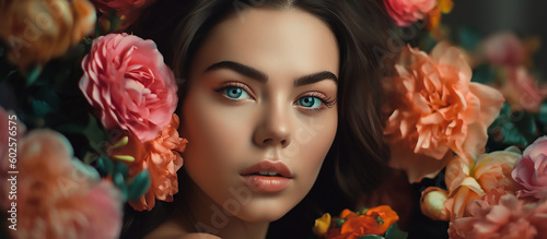 Beautiful white girl with flowers, brunette girl with big bouquet flowers of roses, pretty woman with bright makeup, generative ai tools