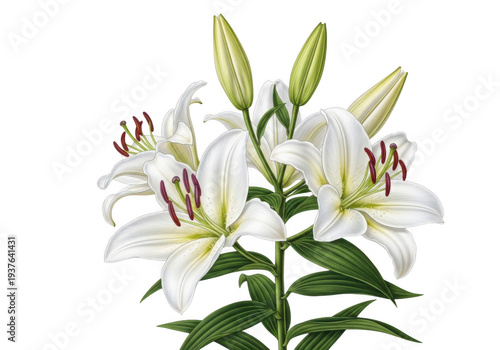 Beautiful white lily flowers with green leaves and buds isolated on transparent background