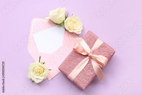 Beautiful white rose flowers with gift box, envelope and blank paper card on purple background