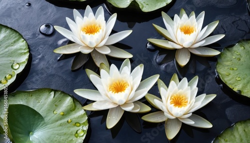 Beautiful white water lilies, a flora of summer nature, blossom as aquatic flowers in a garden pond