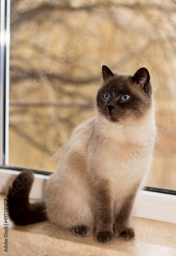 beautiful white-colored British cat at the window