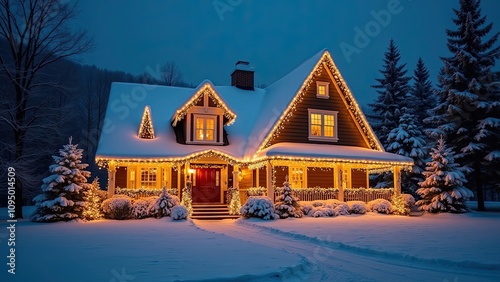 Beautiful winter evening at a cozy house adorned with festive lights in a snowy landscape