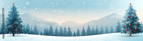 Beautiful winter landscape with decorated Christmas trees, snowy forest, and mountains in the background under a cloudy sky.