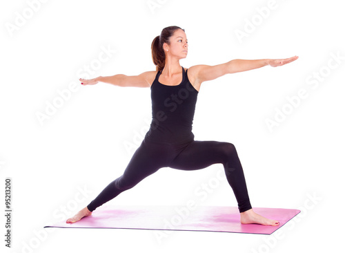 Beautiful woman doing Virabhadrasana 2 pose