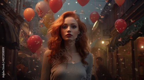 woman, portrait, red hair, street, balloon, city landscape, light, dreamy, romantic, fashion, editorial, beauty, girl, young, model, face, expression, hair, long, wavy, skin, smooth, eye, lip, nose, cheek, chin, neck, shoulder, arm, hand, leg, foot, stylish, elegant, colourful, atmosphere, background, pensive, serene, charming, lovely, vibrant, urban, photo, artistic, creative, visual