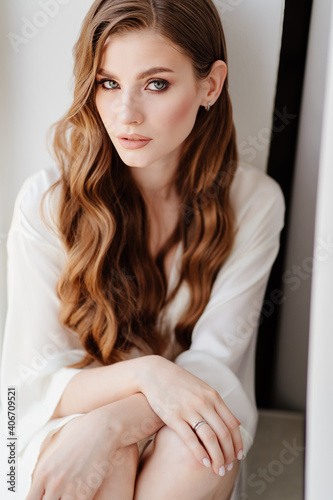 beautiful woman in white robe sits on windowsill.morning of bride before wedding