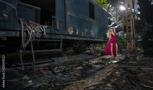 Beautiful woman on abandoned train station in red dress