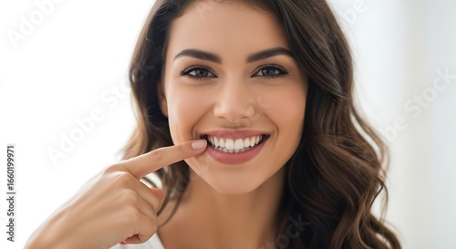 woman, smile, teeth, dental, white, honed, healthy, beauty, face, portrait, happy, cheerful, attractive, young, person, female, pointing, finger, clean, hygiene, oral, care, cosmetic, treatment, whitening, bright, closeup, expression, positive, joy, confidence, wellness, lifestyle, gorgeous, pretty, brunette, hair, looking, camera, studio, indoor, light, background, isolated, natural, fresh, radiant, glow