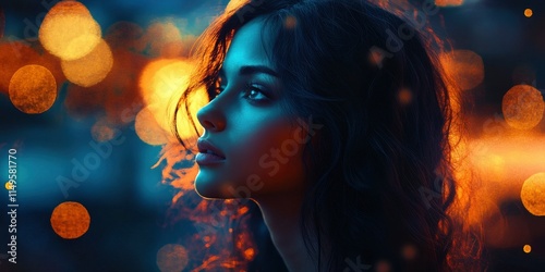 beautiful woman with dark hair, blue and orange lighting, blur bokeh background