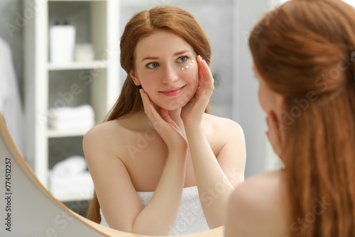 Beautiful woman with freckles and cream on her face near mirror in bathroom