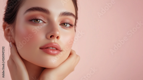 Beautiful woman with glowing skin and natural makeup on pink background, banner, perfect for gift shop promotions, beauty brands, and heartfelt holiday messages.