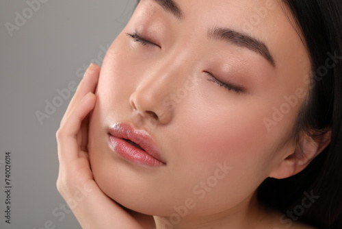 Beautiful woman with healthy skin on gray background, closeup