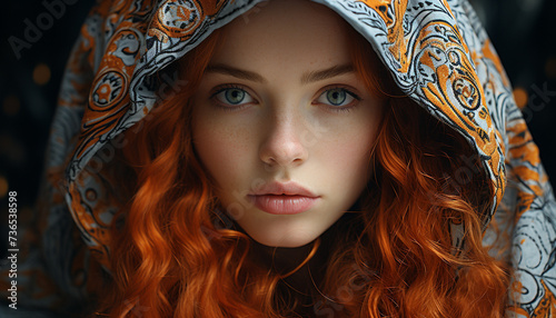 Beautiful woman with long, curly brown hair, looking at camera generated by AI
