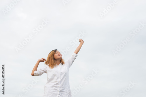 Beautiful women standing raising arm after waking, enjoy with fr