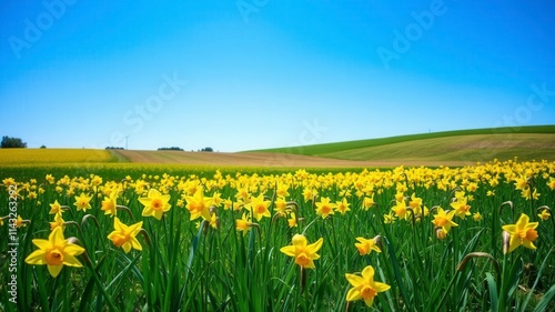 Beautiful yellow daffodil flowers blooming in a vast field, under a clear blue sky, landscape, vibrant