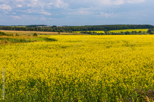 Beautiful yellow fields of blooming rapeseed in sunny weather in spring or summer. Landscape. Ecological culture. Biofuel.
