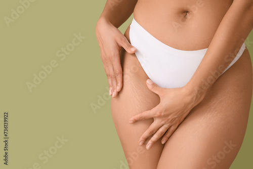 Beautiful young African-American woman with stretch marks on her body against green background, closeup