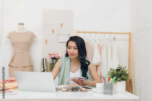 Beautiful young Asian business woman/fashion designer using computer at the workshop