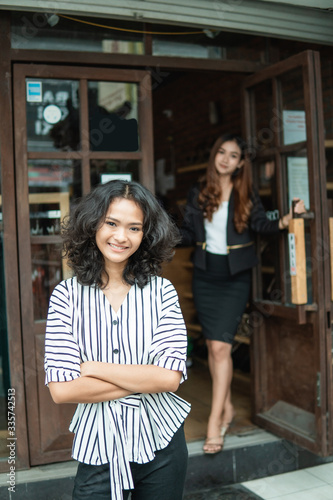 beautiful young asian fashion shop owner at her boutique standing proudly welcoming customer at the store front