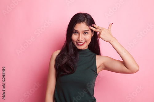 Beautiful young Asian woman holding fingers in gun gesture.