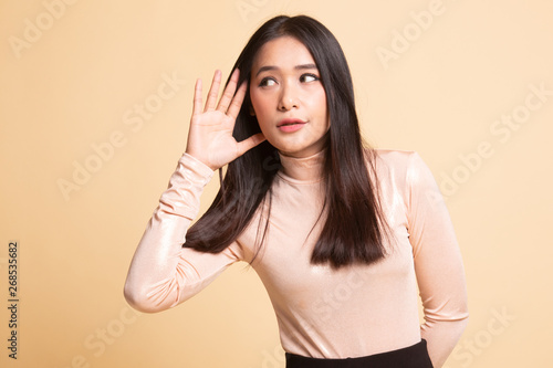 asian, beautiful, communication, ear, female, girl, gossip, hand, hear, lady, listen, listening, news, person, portrait, secret, studio, woman, young, beige