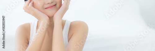 Beautiful young asian woman makeup of cosmetic, girl hand touch cheek on face and smiling attractive, facial of beauty perfect skincare with wellness and wrinkle, skin care and health concept.