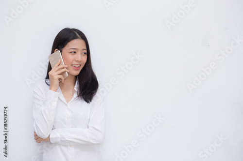 Beautiful young asian woman talking mobile phone and smile standing on cement background, freelancer female calling telephone, communication concept.