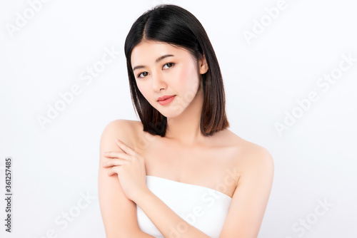 Beautiful Young Asian Woman touching her body with fresh Healthy Skin, isolated on white background, Beauty Cosmetics and Facial treatment Concept.