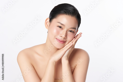 Beautiful young asian woman with clean fresh skin on white background, Face care, Facial treatment, Cosmetology, beauty and spa, Asian women portrait.