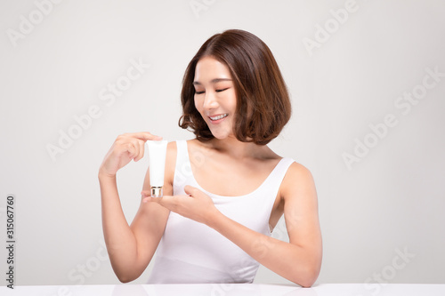 Beautiful Young Asian Woman with short hair Holding luxury white clean tube smile feeling so happy and cheerful with healthy Clean and Fresh skin,isolated on gray background,Beauty Cosmetics Concept