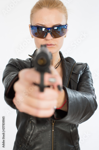 Beautiful young blond woman wearing sunglasses holding a gun