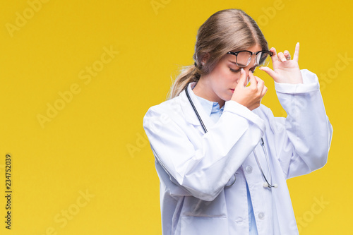 Beautiful young blonde doctor woman wearing medical uniform over isolated background tired rubbing nose and eyes feeling fatigue and headache. Stress and frustration concept.