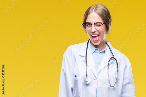 Beautiful young blonde doctor woman wearing medical uniform over isolated background winking looking at the camera with sexy expression, cheerful and happy face.