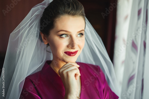 Beautiful young bride with wedding makeup and hairstyle in bedroom, attractive newlywed woman have final preparation for wedding. Happy Bride waiting groom. Marriage Wedding day moment. Bride portrait